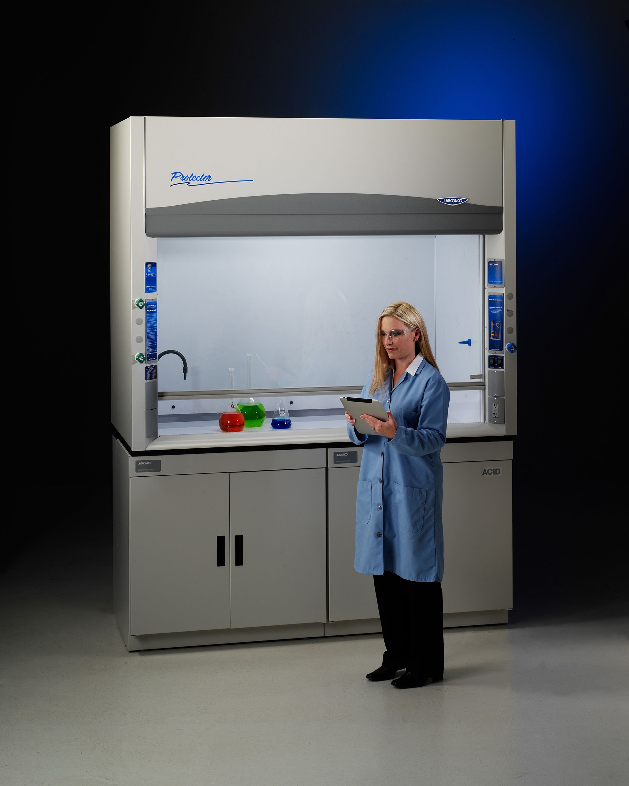 - Створка: вертикально поднимающаяся створка из закалённого безопасного стекла толщиной 3/16", пригодная для работы с перхлоратной кислотой.