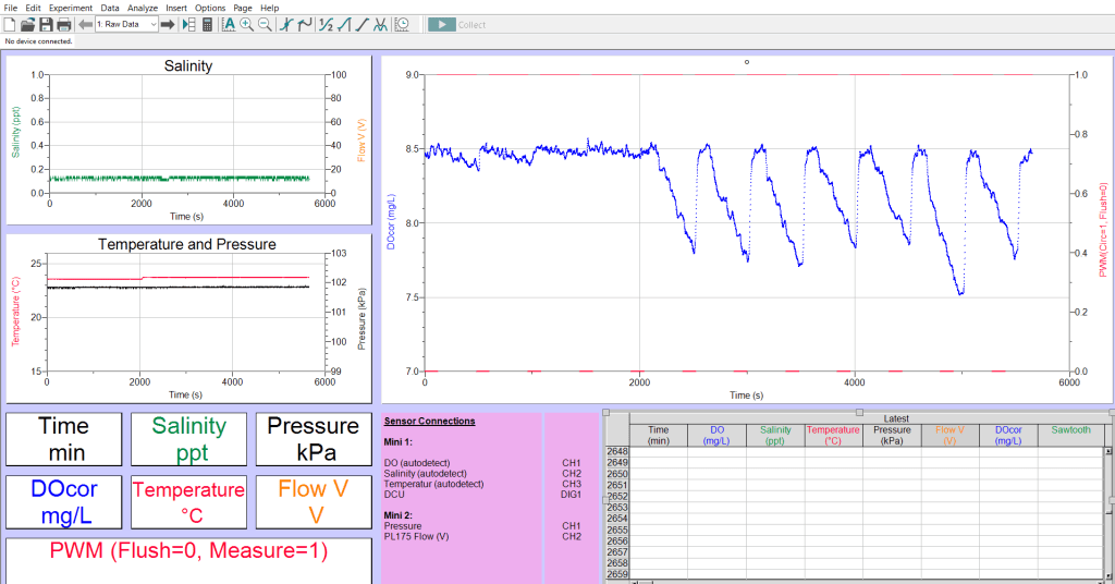 - Во время эксперимента вода циркулируется через камеру с животным и через сосуд с оптическим датчиком DO, управляемая жидкостным насосом.