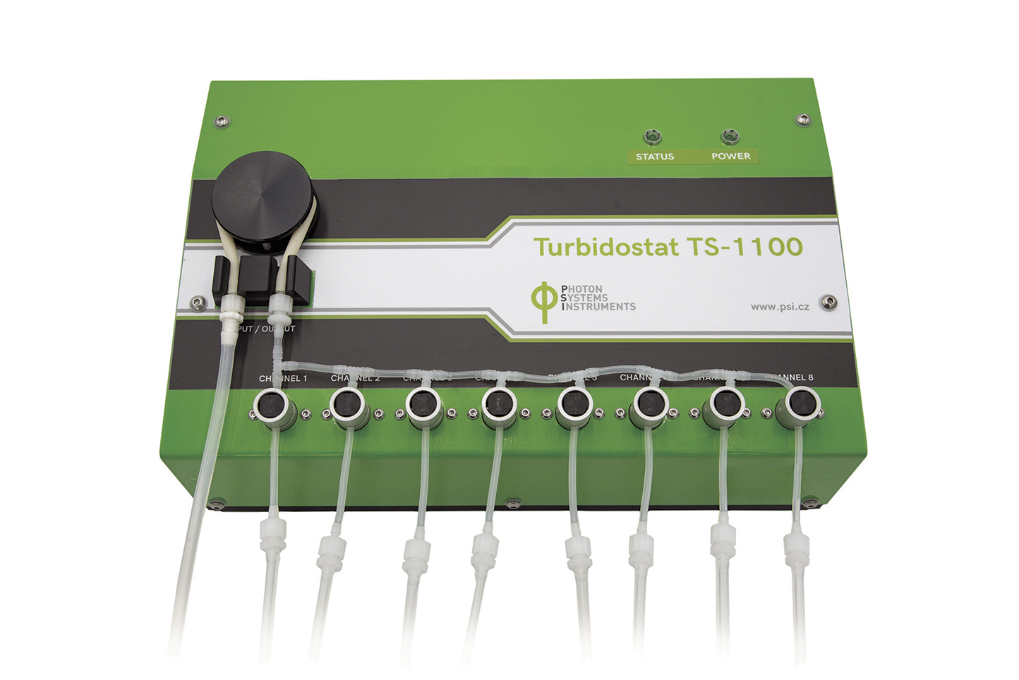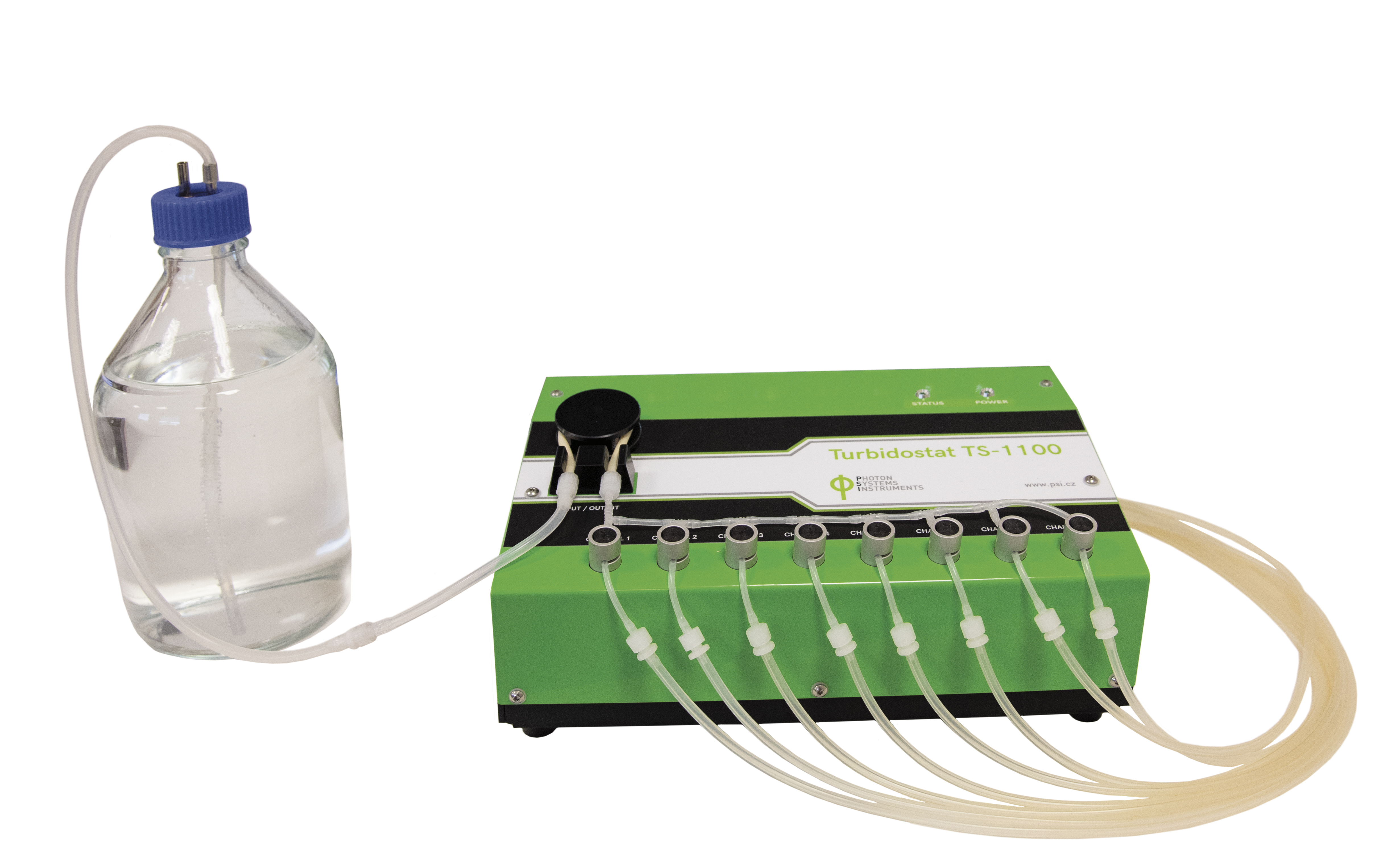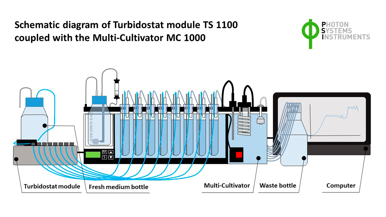 Turbidostat Module TS 1100 — это дополнительный модуль к Multi-Cultivator MC 1000, обеспечивающий непрерывный режим культивирования (continuous-flow), при котором концентрация (оптическая плотность, OD) в каждом сосуде поддерживается на заданном уровне. Свежая среда непрерывно подаётся при помощи перистальтического насоса и распределяется через 8 независимых клапанов к каждому сосуду.