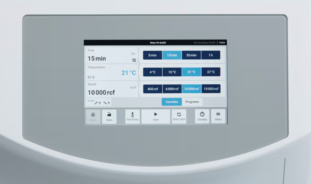 Eppendorf Centrifuge 5910 Ri – это современная рифрижерированная настольная центрифуга, отличающаяся простотой эксплуатации и высокой универсальностью. Благодаря большому 7-дюймовому сенсорному интерфейсу VisioNize®, интуитивно понятному управлению и множеству функций по документированию, устройство обеспечивает быстрые, точные и воспроизводимые центрифугационные циклы.