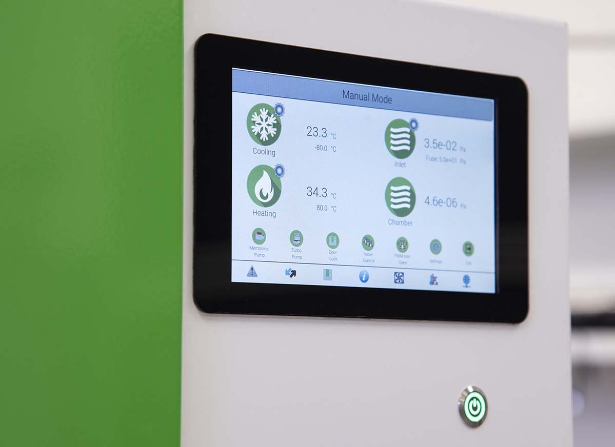 - Встроенный сенсорный экран: ручное управление подачей/закрытием клапанов, SplitFlow, заданием температур нагрев/охлаждения