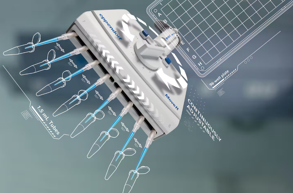 Eppendorf переосмыслил концепцию пипеток с регулируемым расстоянием наконечников, создавая их с нуля по своим премиальным стандартам. Move It® – это ответ на запросы клиентов, ищущих эффективное и безопасное решение для синхронного пипетирования серии образцов между различными форматами сосудов (например, пробирки ↔ планшеты). Что делает Move It® уникальным? Устройство способно работать без трубок между коническим элементом и поршневой системой, что: