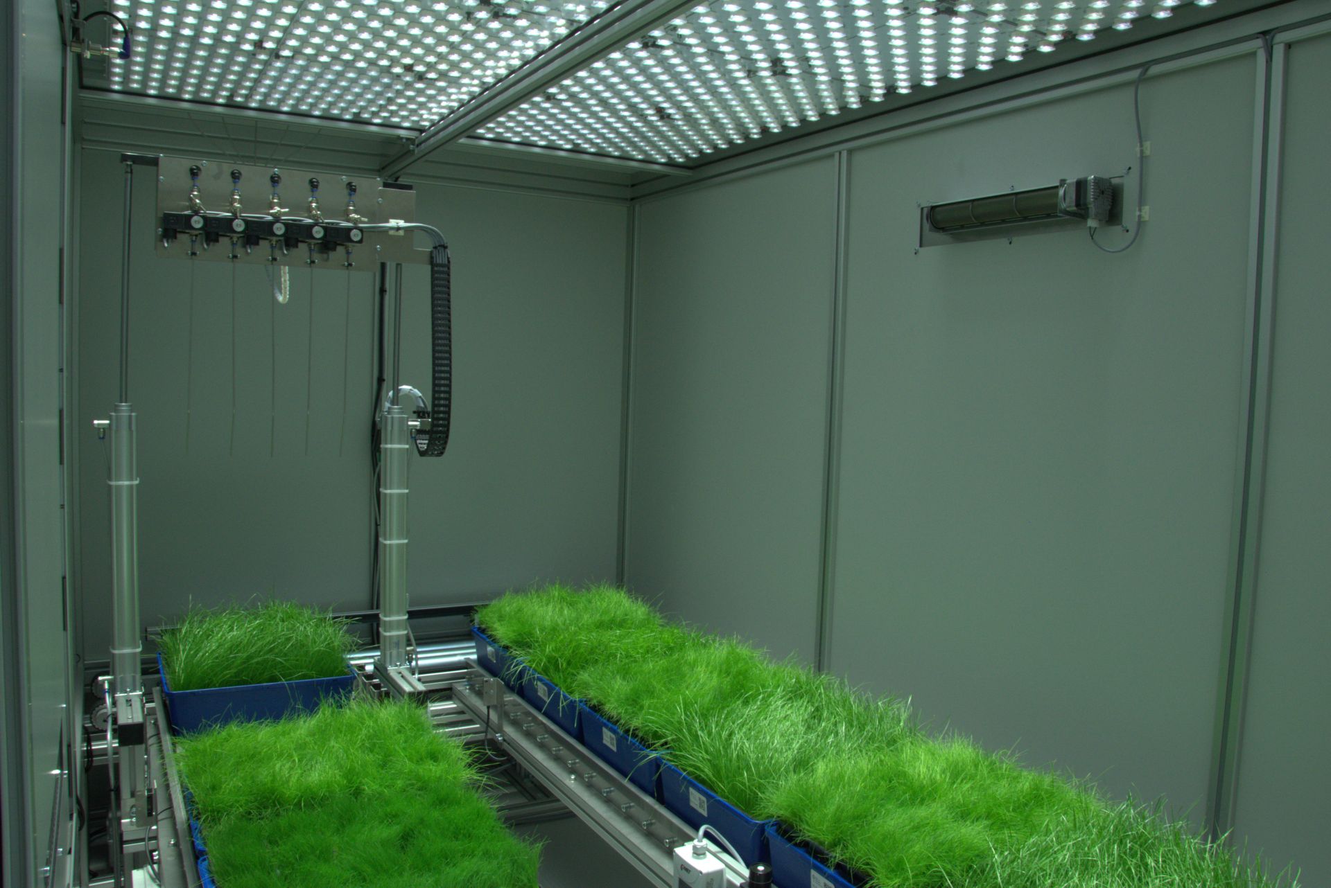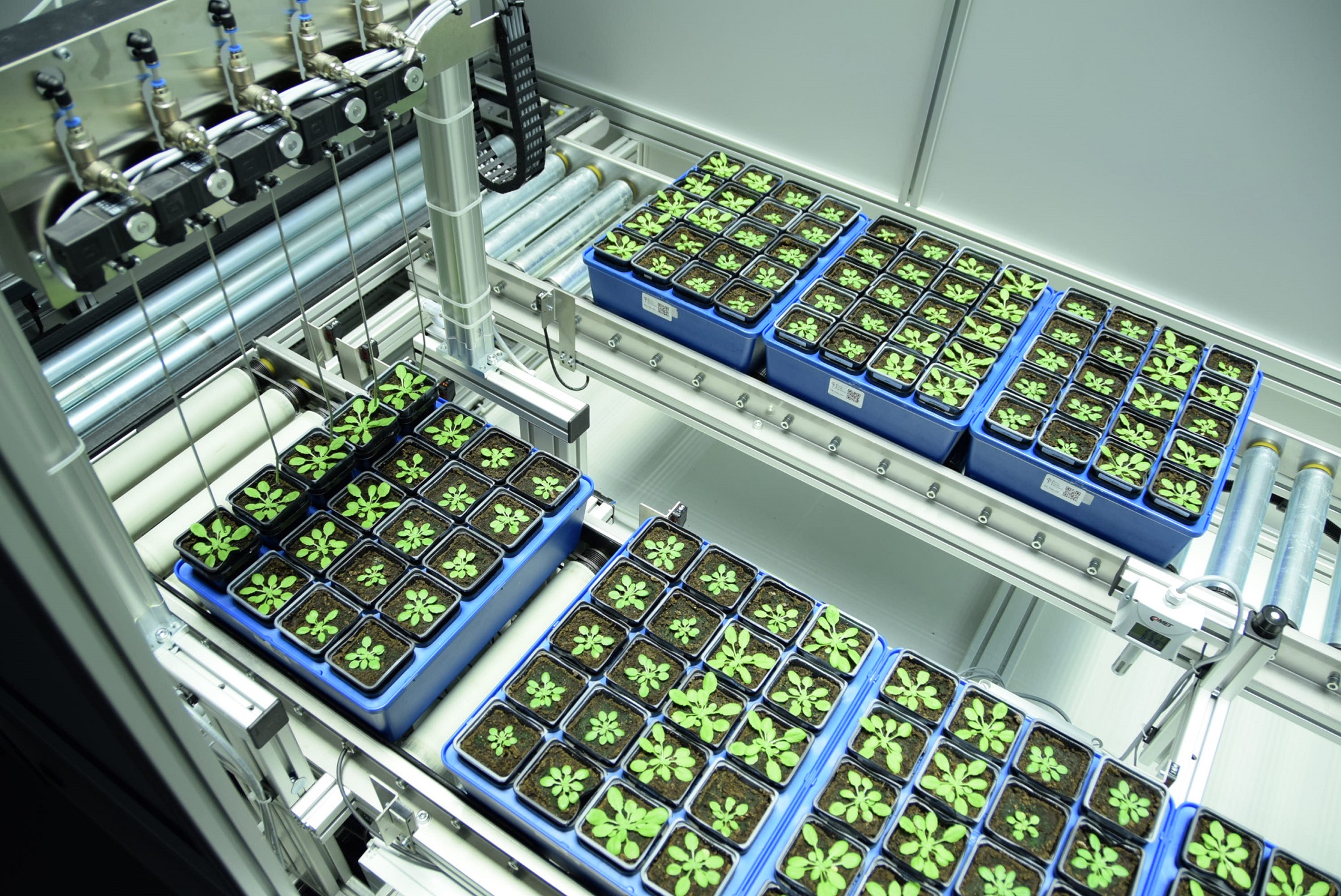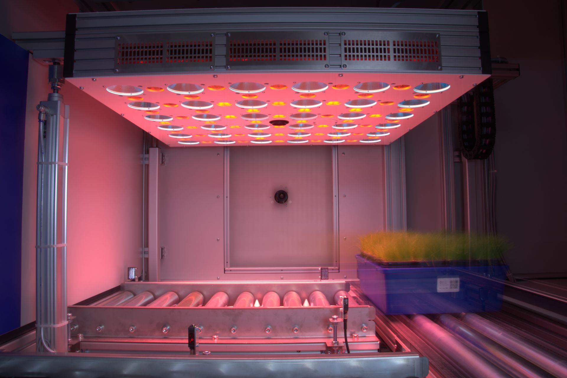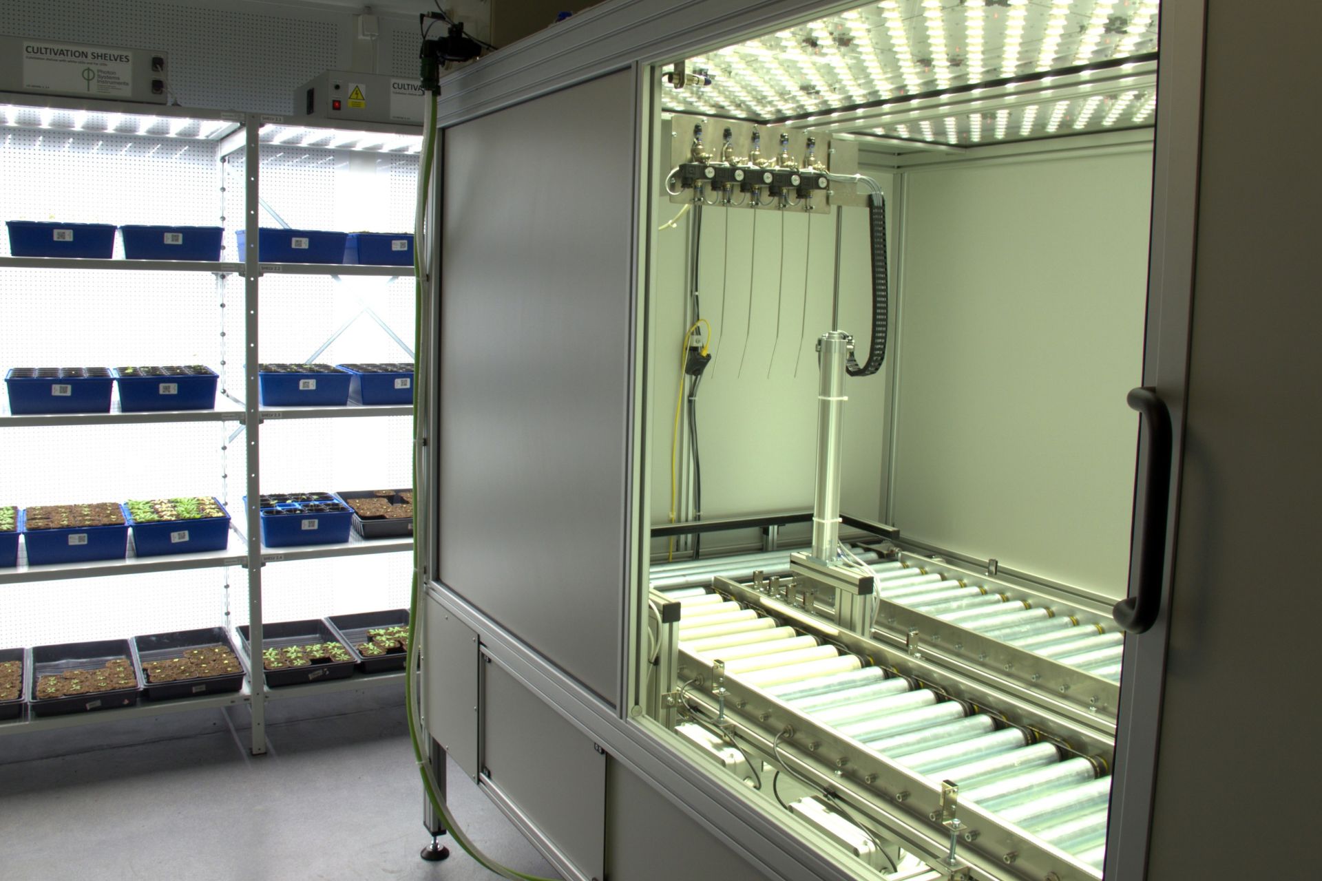 - Поддоны с растениями перемещаются по конвейеру в автоматизированные модули съёмки (камеры).